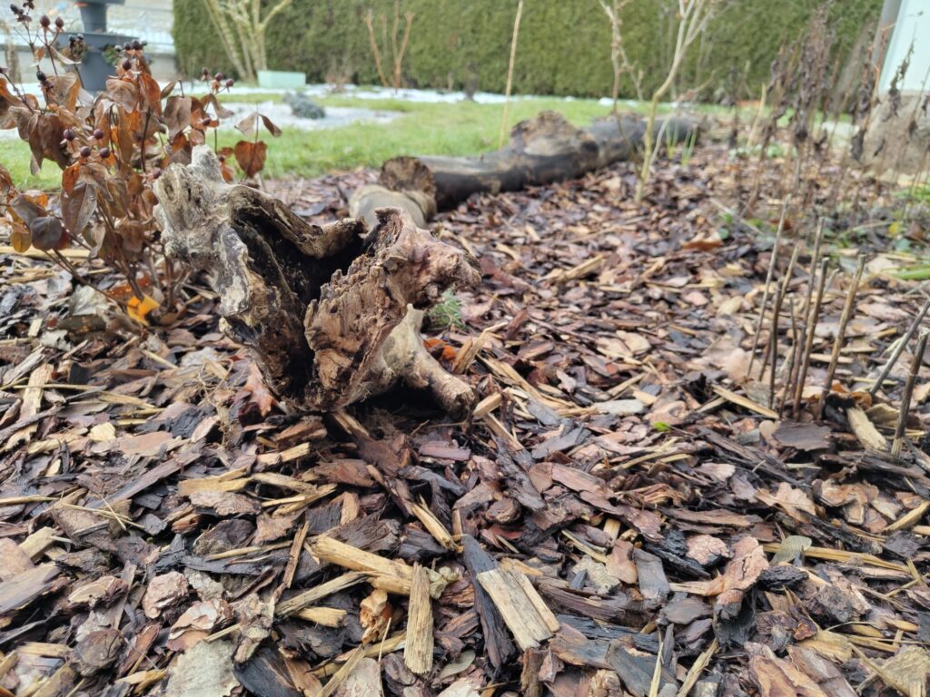 - Staudenflächen: Ein liegender Stamm kann Struktur geben und Feuchtigkeit im Boden halten.