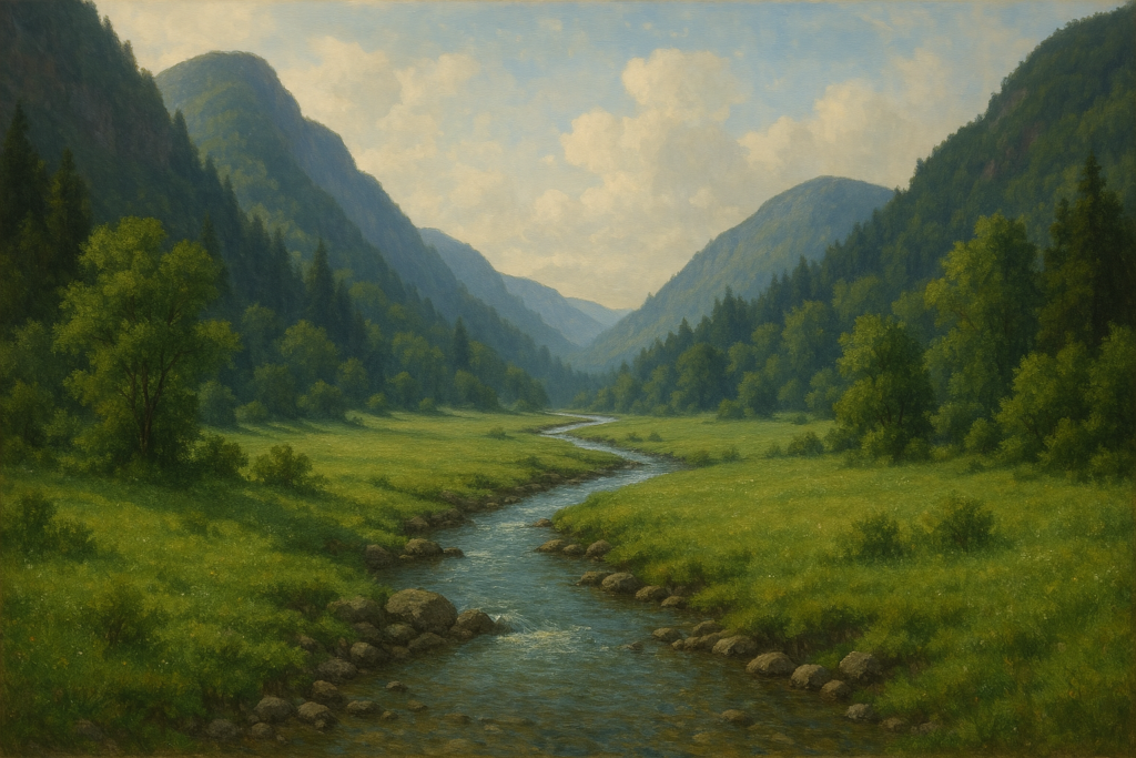 Der Eisrinn kam aus den Bergen und arbeitete langsam und beständig. Jahr um Jahr legte sein Wasser feine Mineralien, die es aus den Bergen ausgespült hat in die Mulden des Tales, schob Erde an neue Stellen und webte so aus flachen Senken saftige Auen. Das Tal atmete leise: Wasser, Wind, Vogelruf. Es war ein Ort der wuchs, ohne dass ein Mensch davon Notiz genommen hätte.