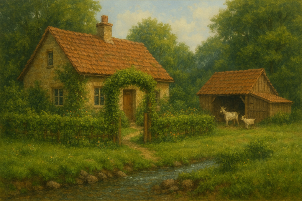 Der Hirte betrachtete sich seine Tiere, ließ seinen Blick über die Auwiesen schweifen, blickte hoch zu den Berggipfeln und entschied, dass auch er nun hier bleiben würde. So errichtete er sich ein kleines Häuschen am Rande der Flutzone mit einem Stall für seine Ziegen und einem Türbogen am Eingang seines kleinen Gartens. An diesen Bogen pflanzte er Efeu – ein Symbol für die unermüdliche grüne Kraft, die in diesem Tal waltet.
